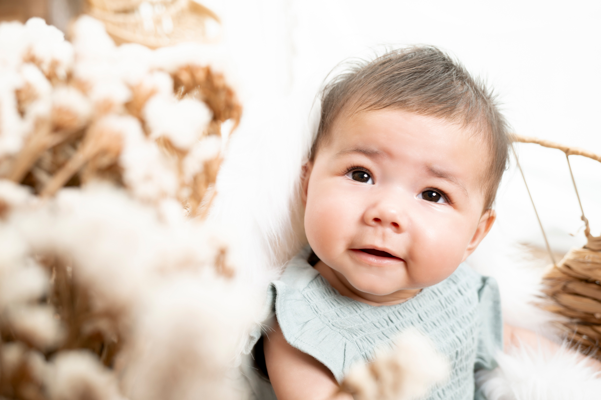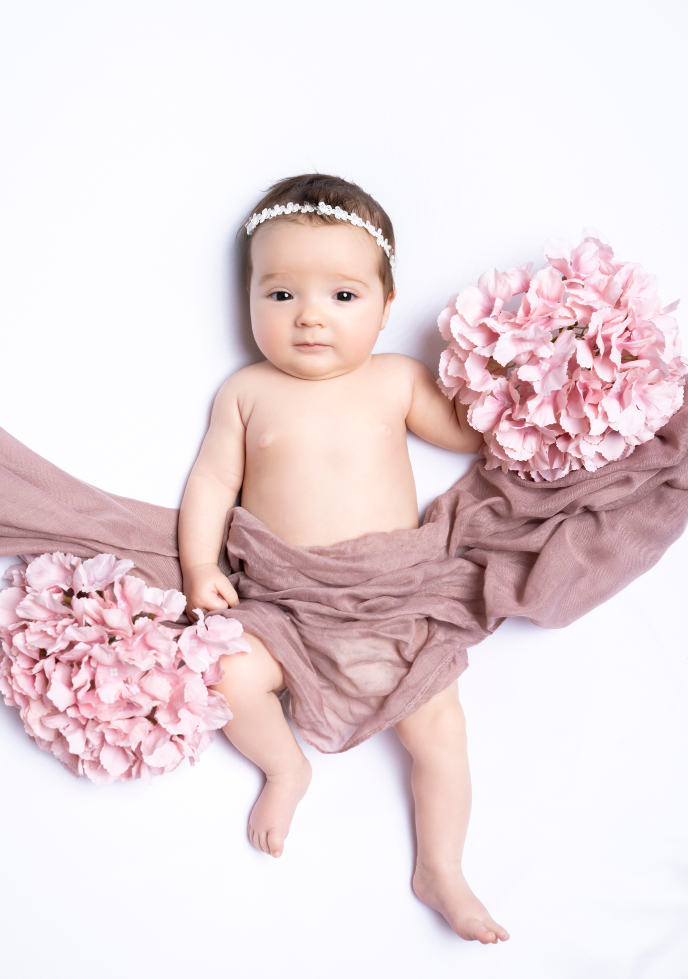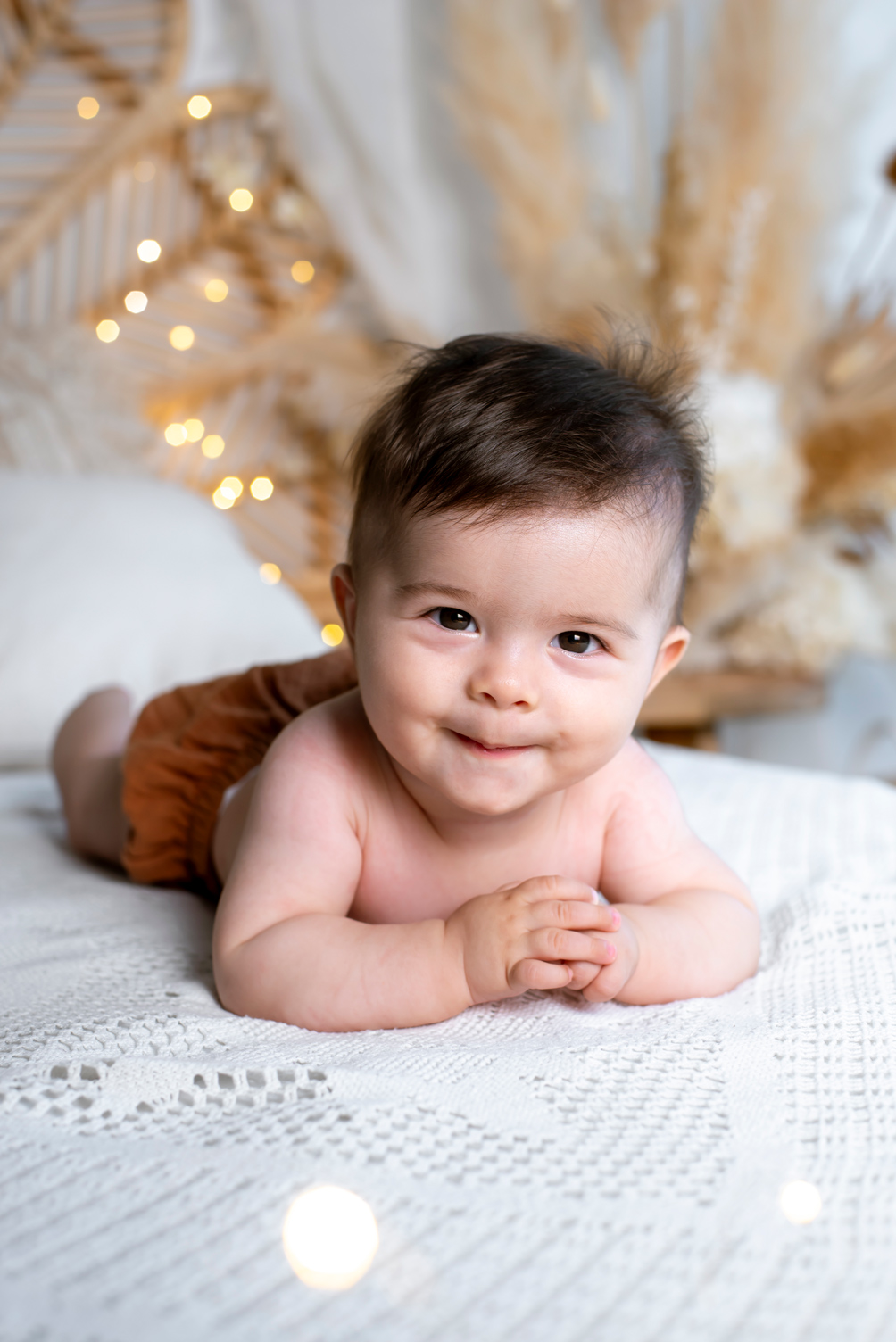 Généralement, je fais des photos sur fond blanc, sur fond noir et aussi de bébé seul dans des tissus. Un nouveau décor «bohème» est également disponible.
